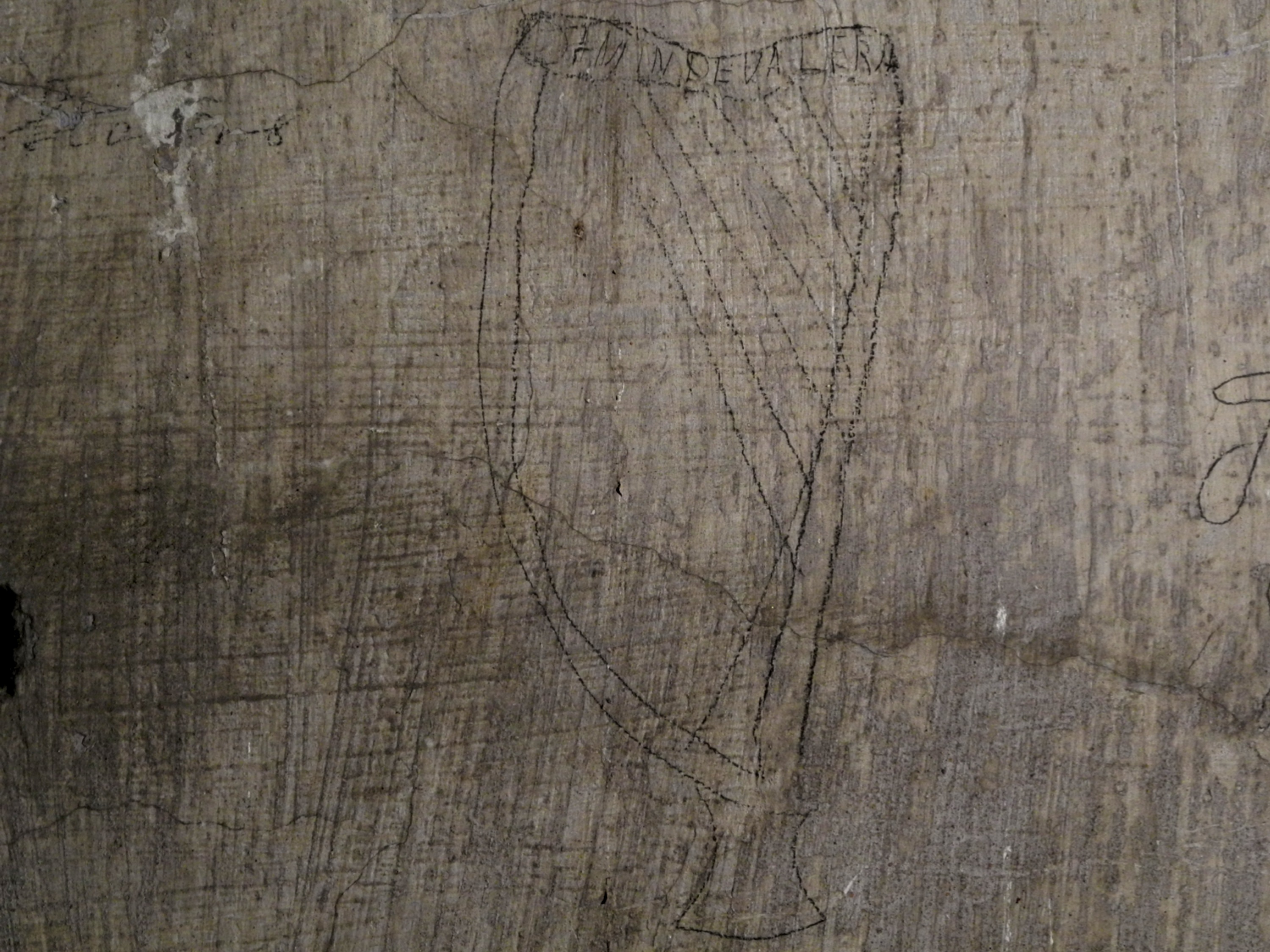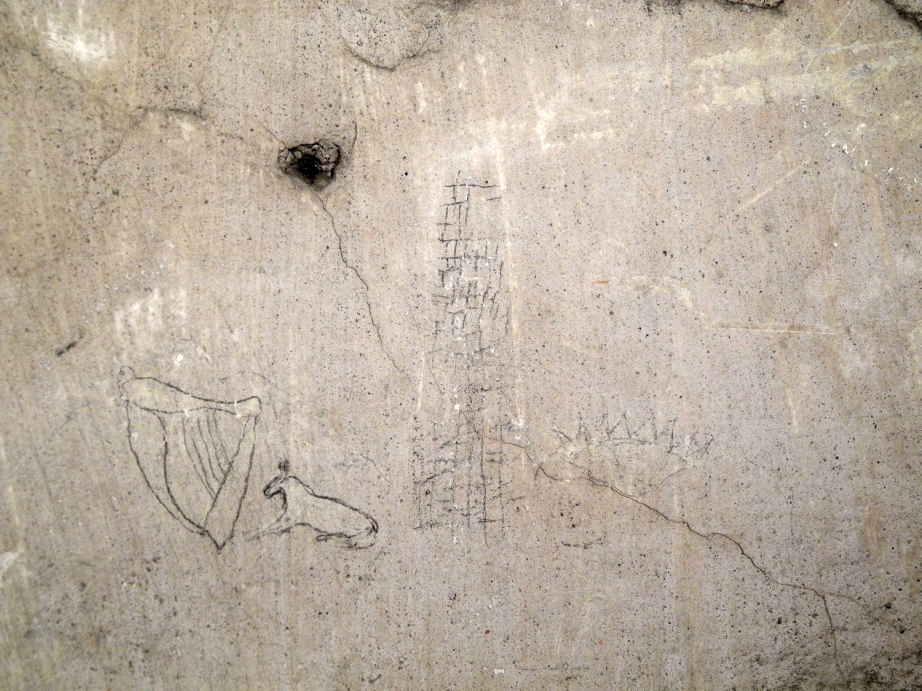 A harp in pencil over whitewash located in a cell on Corridor 2 of the Top Floor with a reference to ‘DeValera’ on top.