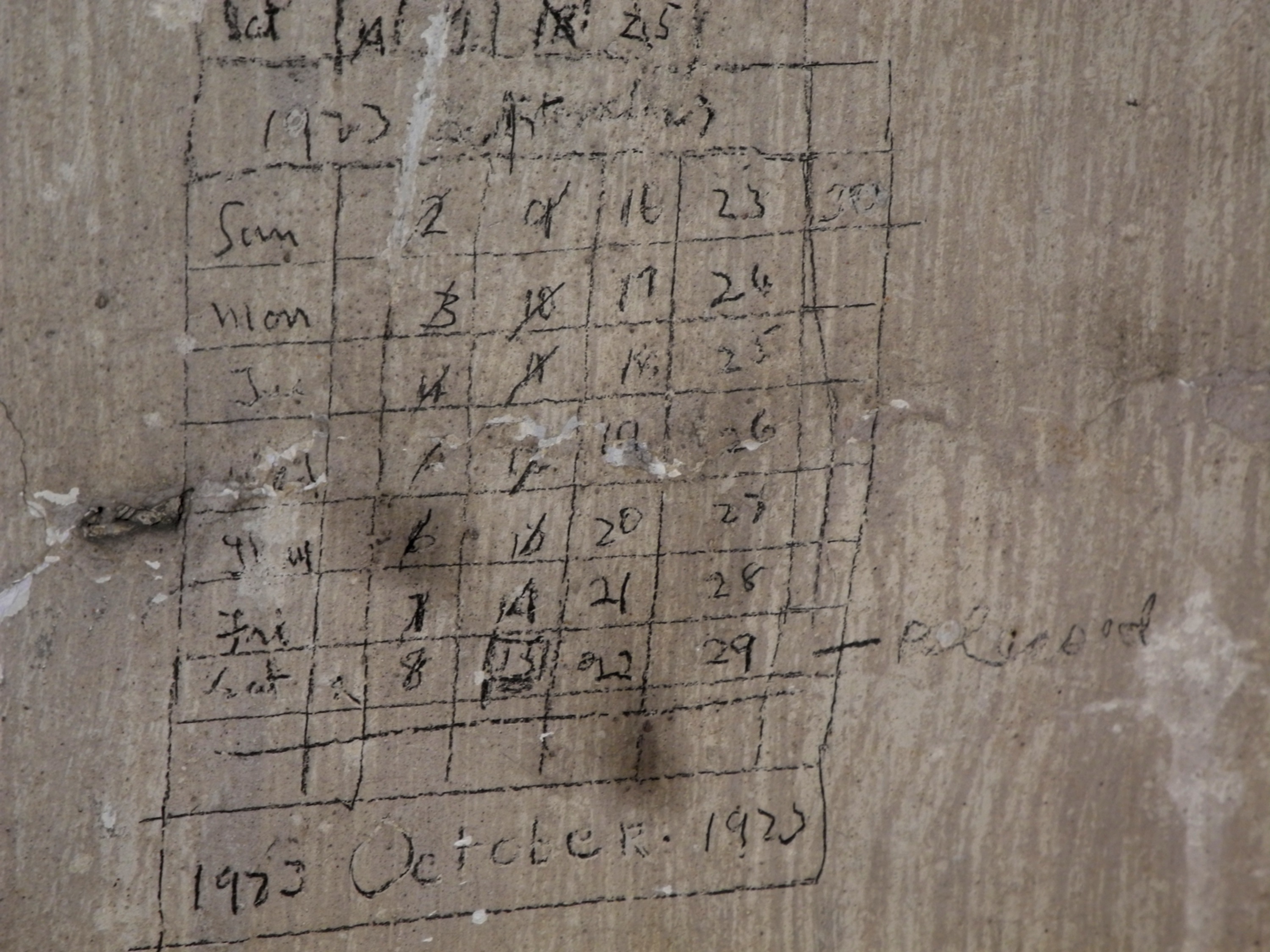 One of the most frequent graffiti forms found throughout the Wing, and often created by both male and female prisoners, were calendars to literally mark off time. At times these were constructed to tick off a long, running tally of days at other times they were made to tick off a full month:
