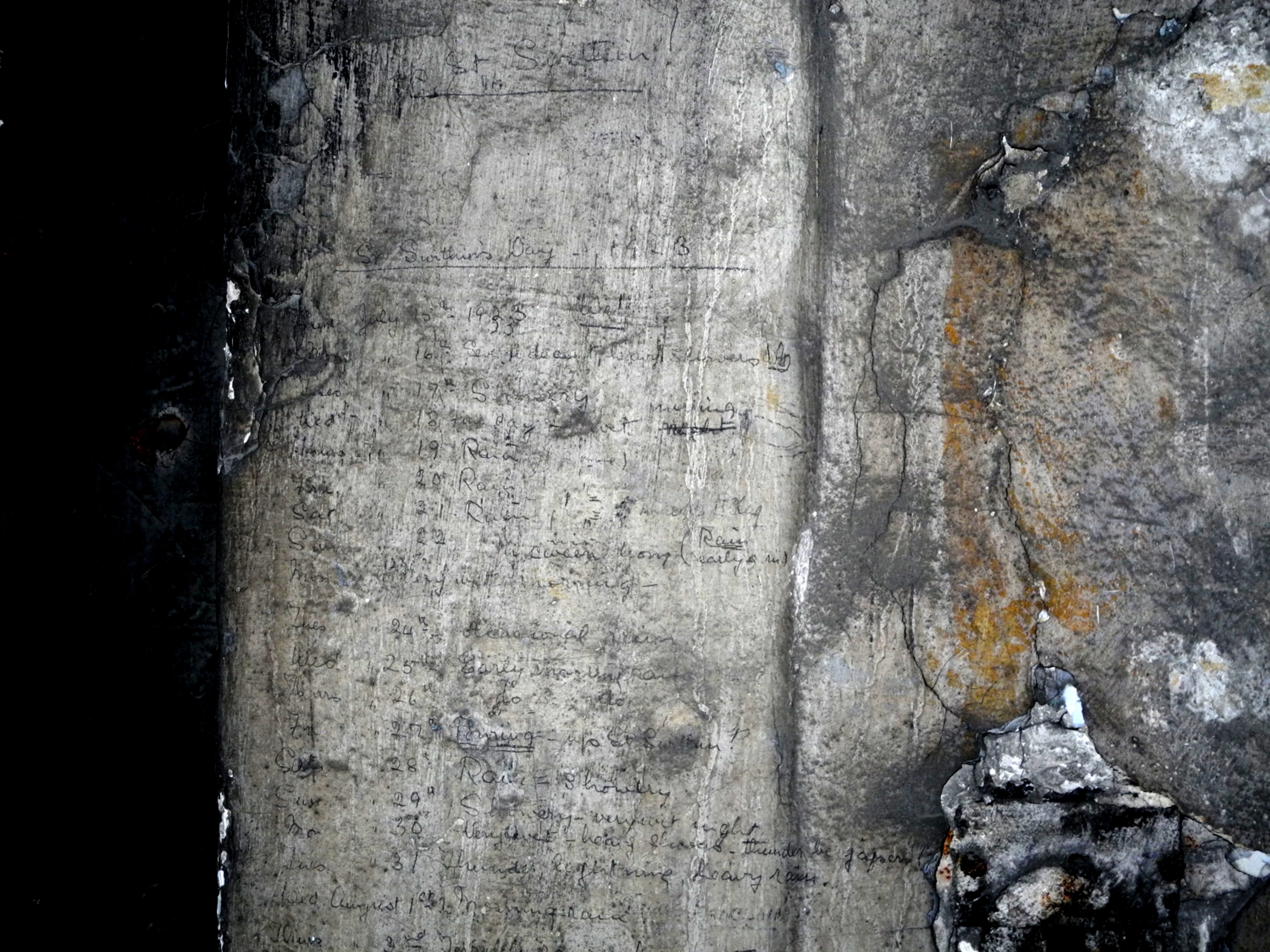 With many of these examples engraved across large swathes of wall long covered by whitewash these may have been initially used by less literate and numerate prisoners from years before the period of political incarceration? One particularly interesting, and unusual, example is the faint remnants of a St Swithin’s Day calendar that Cecilia Gallagher was said to have kept in a cell on Corridor 1 of the Top Floor: